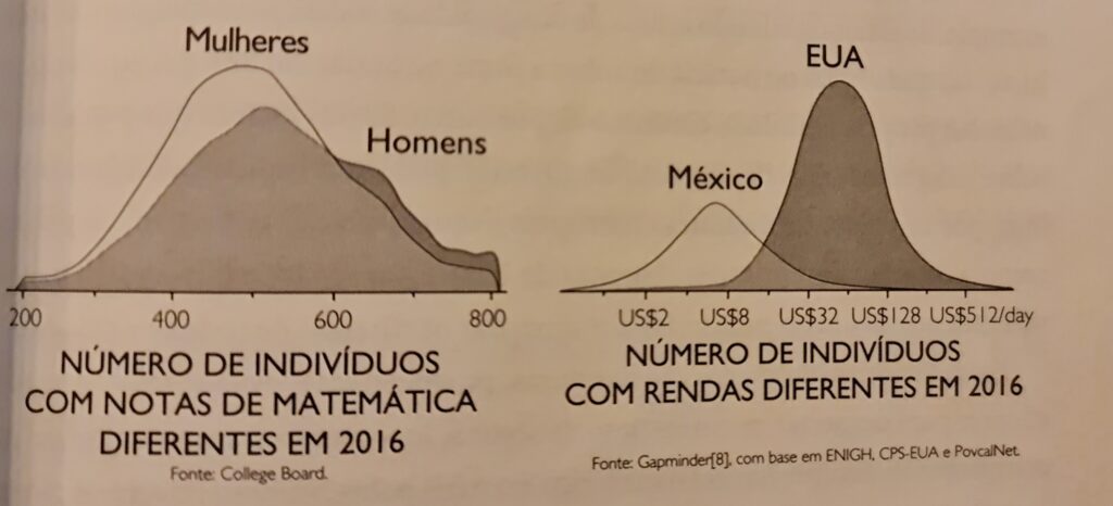 Uma das armadilhas mais comuns sugeridas pelo instinto de separação é a utilização de médias. Comparações baseadas nelas normalmente chegam a conclusões binárias. Rosling nos fornece dois exemplos práticos interessantes, o primeiro consiste nas notas médias de matemática na prova SAT entre homens (527) e mulheres (496), diferença que se manteve constante ao longo do tempo. Com base nesse resultado, nosso instinto de separação poderia facilmente sugerir a conclusão comum de que homens são bons em matemática e mulheres não, situação que é desmentida quando se avalia a distribuição das notas e enxergamos que há quase uma equivalência entre homens e mulheres, com a diferença de que há uma preponderância maior do sexo masculino a partir do score 600.