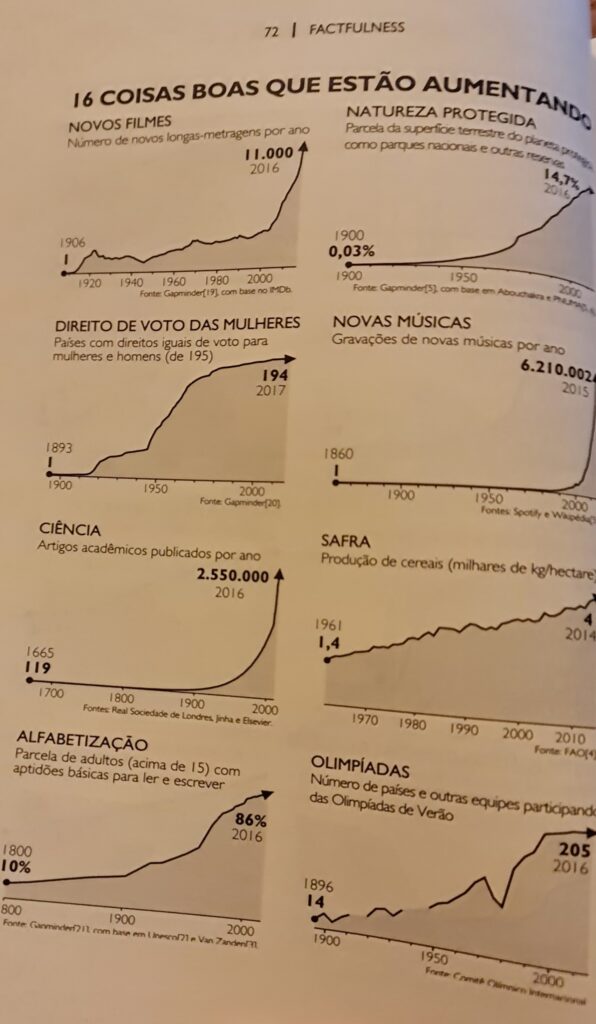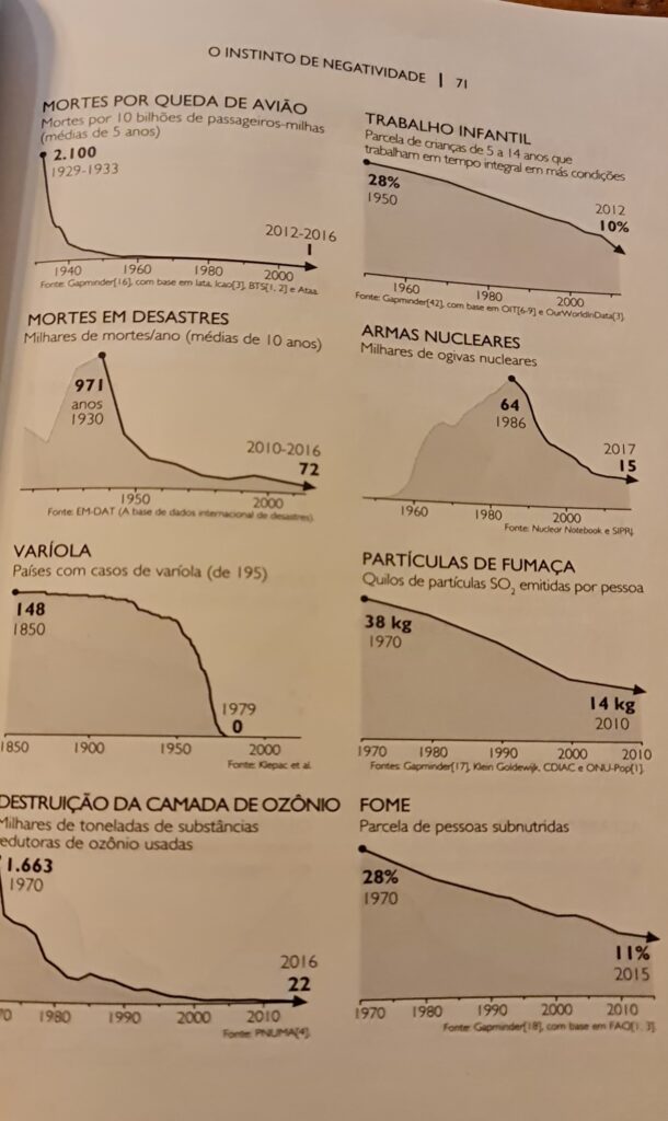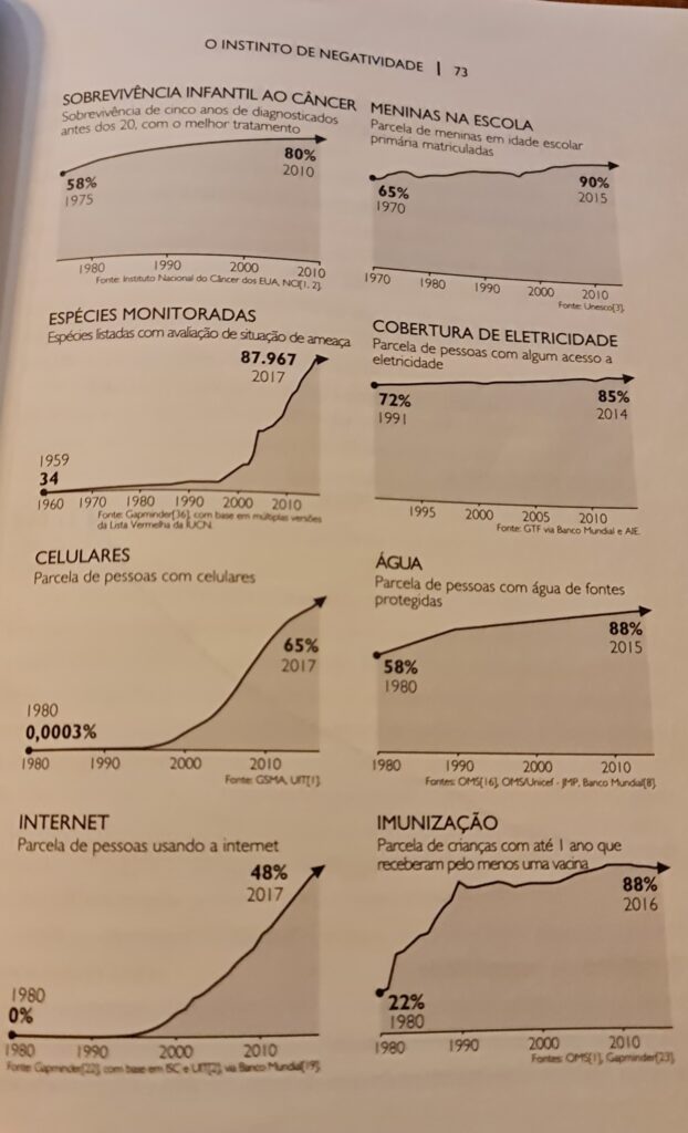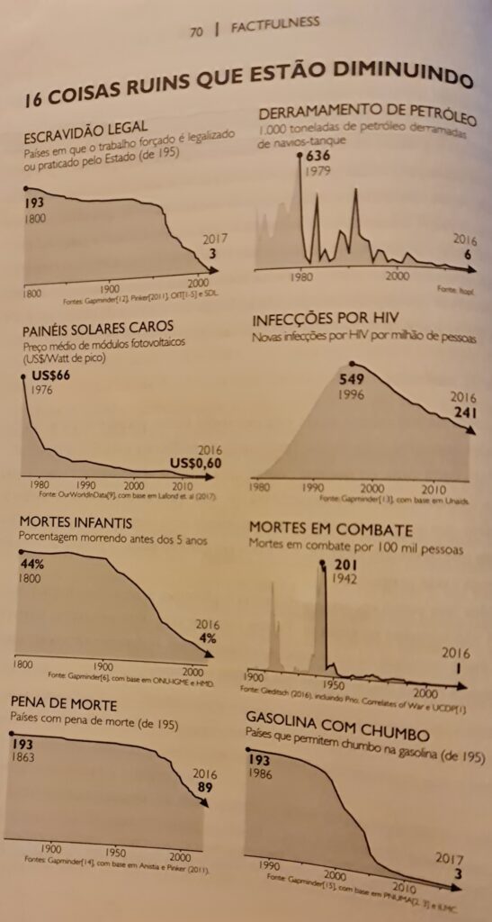 A taxa de crime nos EUA vem caindo desde 1990 continuamente e a maioria da população, quando perguntada a respeito, afirma que a situação da criminalidade está piorando. Lembrem-se que mídia e ativistas dependem de drama para conseguir sua atenção. E por que então não admitimos isso? O autor nos coloca uma explicação bem plausível: ‘’você sente que minha afirmação de que o planeta está ficando melhor é como falar que tudo está bem, ou que não devemos mais focar nos problemas. Isso parece ridículo, até estressante’’. É incrível como as pessoas tem dificuldade para entender que muitas vezes as coisas podem estar ruins e melhores ao mesmo tempo.