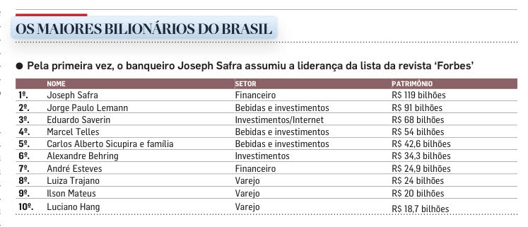 Muito bem. Então vamos tirar dos ricos. Está aí a lista dos brasileiros mais ricos, segundo a última edição da Forbes.