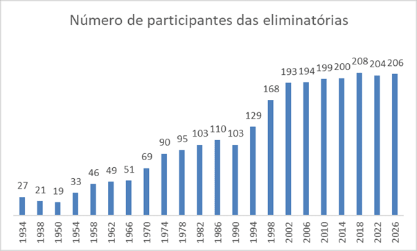 No gráfico a seguir, temos a evolução do número de participantes nas eliminatórias. Observe como temos 4 fases: 1934-1954, com 20-30 seleções, 1958-1966, com cerca de 50 seleções, 1974-1990, com cerca de 100 seleções e 2002-hoje, com cerca de 200 seleções.