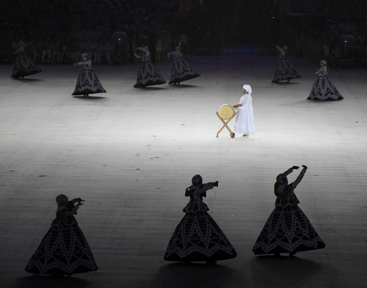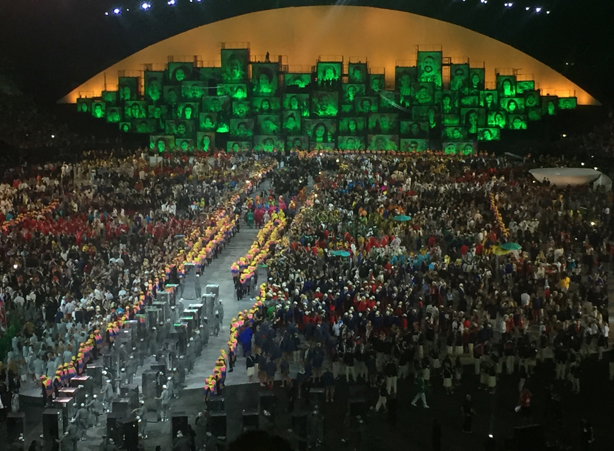 E, criou um novidade : a genial sacada do desfile das delegações por uma “avenida central”. Uma solução óbvia, inspirada nos desfiles das escolas no sambódromo, que substituiu a chatíssima volta olímpica feita até então. As bicicletas que puxavam o desfile de cada nova delegação era o símbolo do conceito de “gambiarra” que norteou o show.