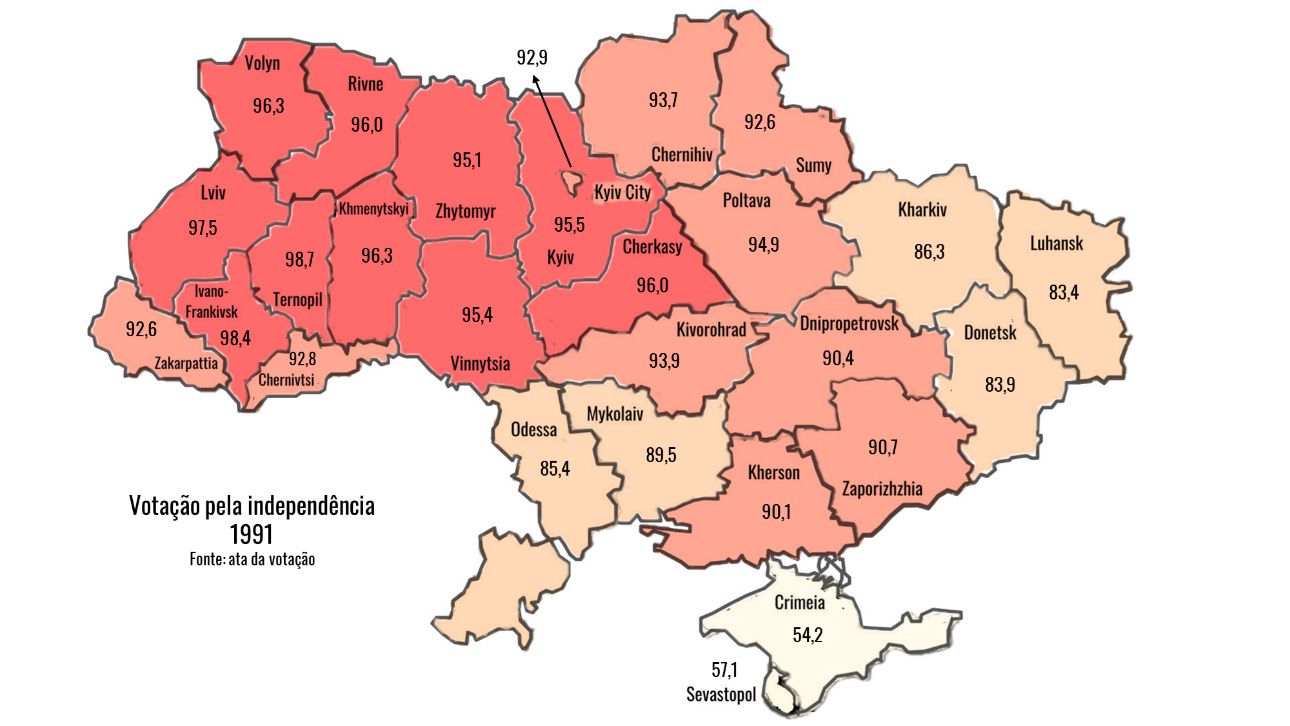 Observe no mapa abaixo que mesmo nas províncias do leste, o apoio à independência foi acima de 80% dos votantes. O referendo foi aprovado mesmo na Crimeia e Sevastopol, onde a população de origem russa é ampla maioria.