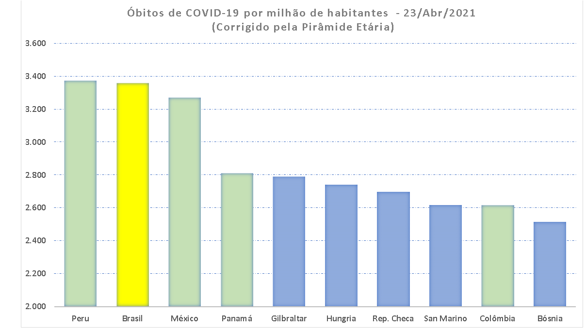Após esses cálculos, o Brasil fica hoje em segundo lugar dentre todos os países do mundo e ultrapassará o Peru porque os óbitos aqui estão acontecendo em ritmo mais intenso, de forma relativa.