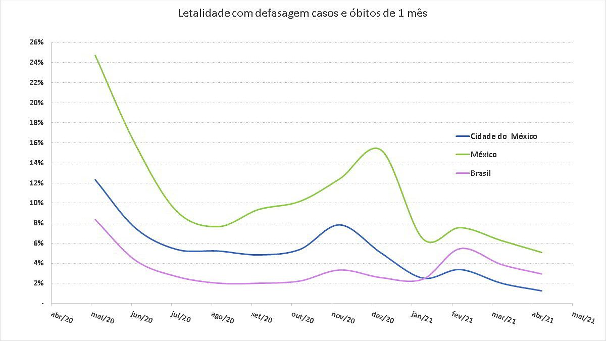 Observe no gráfico que o Brasil está com letalidade bem acima da Cidade do México, embora ainda esteja em um nível menor que no México como um todo.