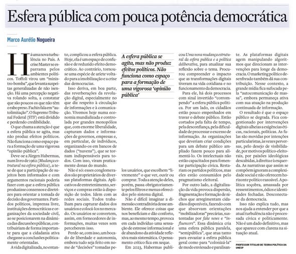 A questão do professor Marco Aurélio, no entanto, não é com a existência de menus, mas com quem produz os menus. O professor cita Habermas, suspirando por um mundo em que “sujeitos bem informados e com argumentos racionais poderiam fazer com que a esfera pública produzisse consensos e diretrizes para orientar a tomada de decisão dos governantes”. E quem contribuiria para que esse debate racional de ideias ocorresse? Aqui está o pulo do gato. Segundo o professor, “partidos políticos, imprensa livre, instituições democráticas e organizações da sociedade civil […] contribuíram para que a cidadania ativa chegasse a conclusões politicamente orientadas”.É o velho mito da sociedade tutelada racionalmente por uma elite iluminada, em que o debate público esclarece as questões controversas e concluiu pelo belo e pelo bom. Obviamente, o belo e o bom de acordo com a visão de mundo do professor Marco Aurélio.
