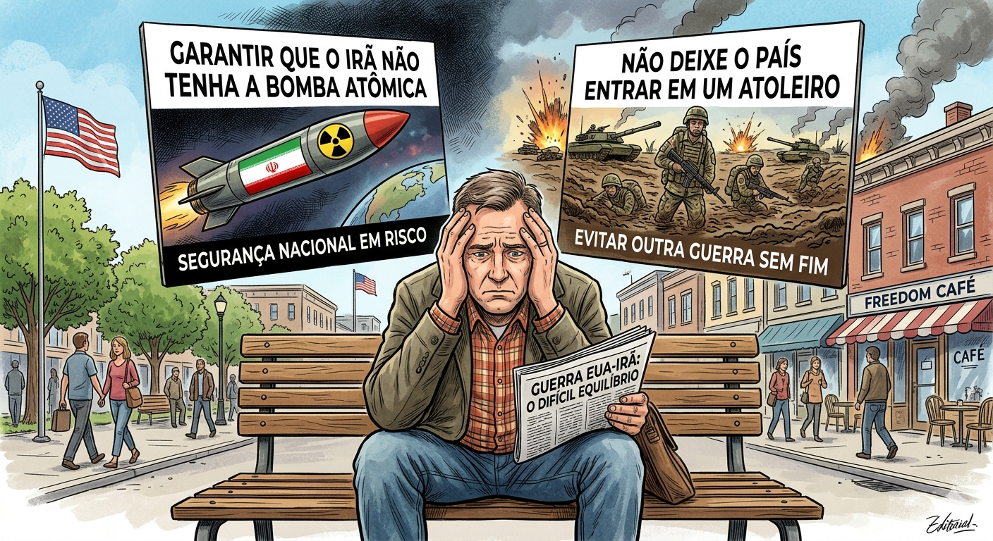 Entre essas três opções, a que o cidadão americano majoritariamente parece aceitar é a primeira: impedir a bomba iraniana sem guerra ampla, por meio de uma combinação de pressão, contenção, diplomacia dura, monitoramento e força apenas como ameaça residual ou instrumento excepcional. Essa preferência aparece de forma consistente nas pesquisas: cerca de dois terços consideram importante impedir que o Irã obtenha arma nuclear, mas a maioria considera que a ação militar foi longe demais; adicionalmente, dois terços querem um fim rápido do envolvimento americano, mesmo que os objetivos declarados do governo não sejam plenamente atingidos (1)(2).