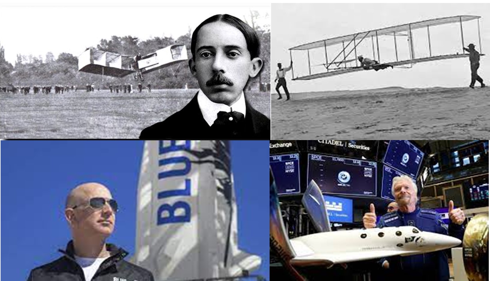 Os irmãos Wright e Santos Dumont voaram pela primeira vez com um aparelho mais pesado do que o ar na primeira década do século passado. Não eram bilionários, mas seus feitos podem ser, de certa forma, comparados com os de Branson e Bezos, no sentido de mostrar a possibilidade tecnológica.