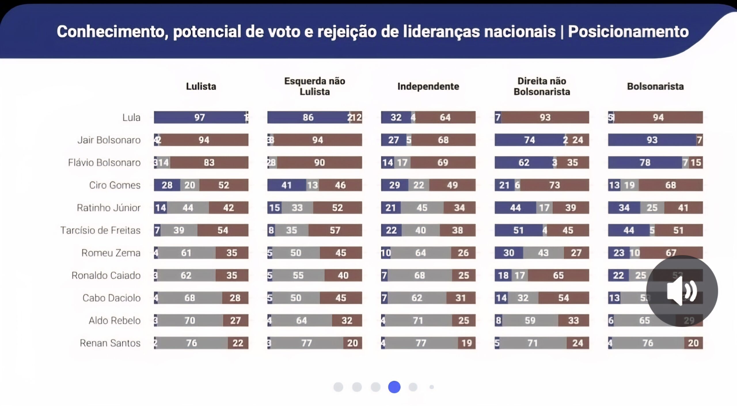 A pesquisa também sugere que Caiado e Zema não têm tanta musculatura eleitoral. Talvez fizesse sentido que os institutos testassem cenários sem eles, concentrando a direita em apenas dois nomes: Flávio Bolsonaro e mais um (Tarcísio ou Ratinho).
