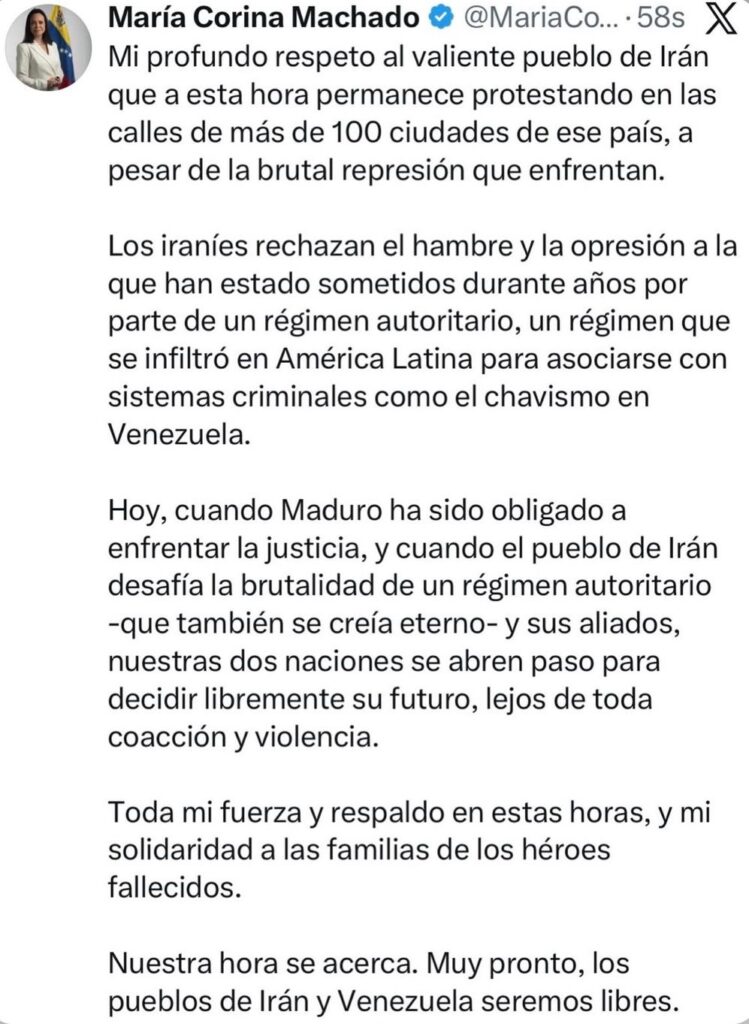 Encerro com mensagem de María Corina aos venezuelanos e iranianos em sua rede social, nesta semana, agitada pelos eventos no Irã, os quais, acaso levem à queda do regime da brutal ditadura iraniana, equivalem à queda de um “novo muro Berlim”, mais um desdobramento com impactos na Gurra Fria 2.0.
