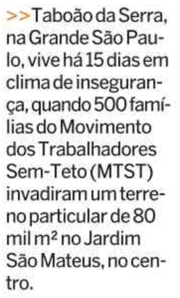 Fevereiro/2009: invasão da sede da prefeitura de Mauá para reivindicar um terreno invadido na cidade e cuja reintegração de posse já havia sido concedida pela justiça. Houve confronto com a polícia.