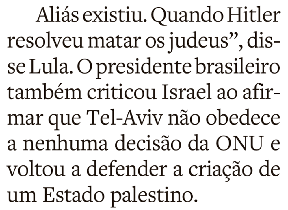 Já com esse trabalho adiantado, eis que o presidente Lula da Silva solta aquela pérola em que compara a guerra em Gaza com o genocídio cometido pelos alemães nos campos de concentração nazistas. Mas poucos se deram conta que, na mesma fala, ele diz outra coisa, reportada pelo Estadão. Vejamos: