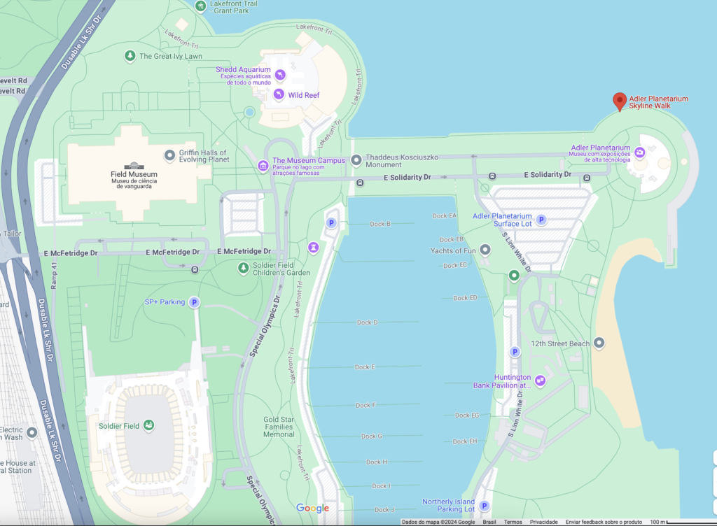 Uma dica que quase ninguém vai te contar: Adler Planetarium Skyline Walk. É deste ponto, entre o planetário e o aquário de Chicago, perto do Field Museum, que você tem o melhor ponto para fotografar o skyline de Chicago! Você pode combinar tudo em um único passeio no Grant Park, no sul da Michigan Avenue. E, se conseguir ingressos, é lá que fica o Soldier Field, estádio que completa 1 século este ano, onde o Chicago Bears manda seus jogos na NFL.