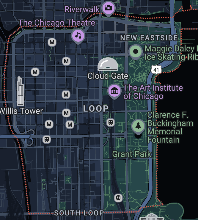 O downtown de Chicago é conhecido pelo apelido The Loop, por conta do percurso que os trilhos suspensos do sistema de trens e metrô fazem na região. Você já deve ter visto em vários filmes e séries, é um sistema seguro e eficiente de transporte para todos os pontos turísticos, relativamente silencioso e, ao contrário do que aconteceu em cidades brasileiras, como o Minhocão paulistano, não degradou as ruas pelas quais ele passa, apesar da extrema proximidade com fachadas de edificios. Diria até que eu alguns trechos, como nas pontes que atravessam o rio Chicago, a estrutura de aço aparente dá um certo charme vintage ao urbanismo da região.