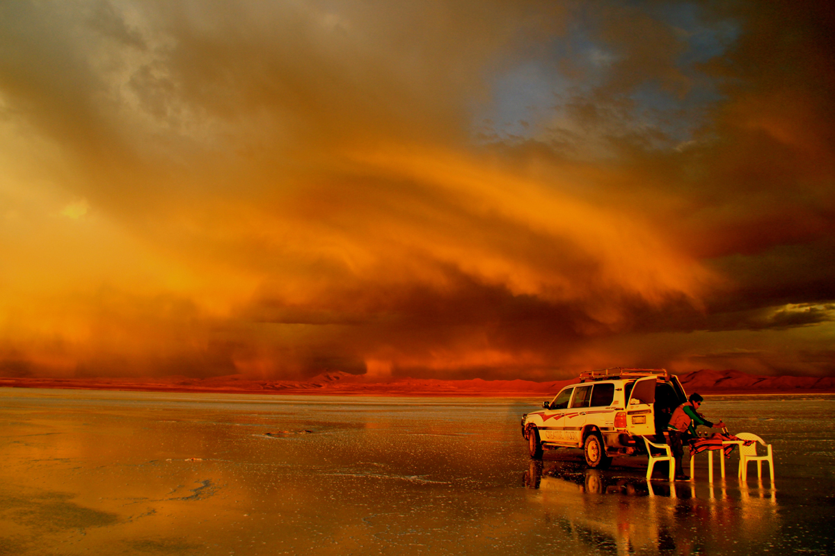 As nuvens pretas carregadas, chuva forte e raios nos acompanharam pelos 300km do caminho, primeiro por uma estrada de terra… depois por trilhas… e finalmente pela areia, até chegar no ponto mais isolado da viagem, o hotel Tayka del Desierto. Implantado em uma encosta no meio do nada, o hotel tem vista para um ponto da cordilheira dos Andes que delimita a fronteira com o Chile.